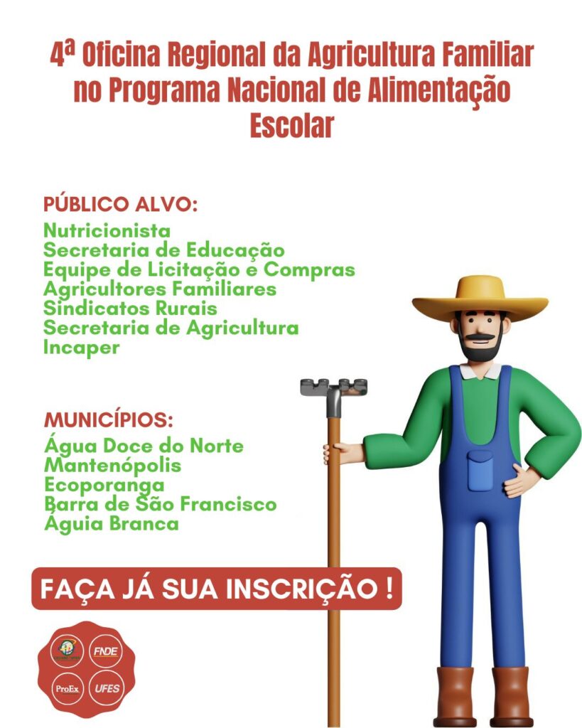 O evento, ofertado pela Universidade Federal do Espírito Santo(CECANE-UFES), tem como objetivo fazer o levantamento da demanda da alimentação escolar e da produção da agricultura familiar e de povos e comunidades tradicionais para a boa execução do PNAE dos municípios selecionados. A oficina visa ainda favorecer a troca de vivências, encontro e diálogo entre os municípios e entre atores pertinentes às duas pontas da cadeia de oferta e demanda dos produtos da agricultura familiar.