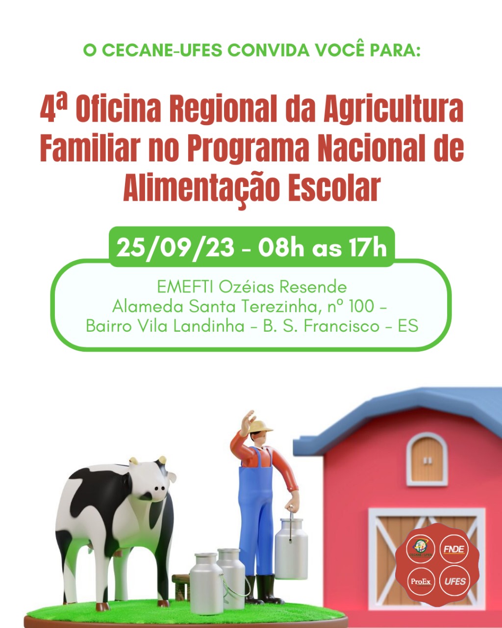Acontece no dia (25), de 8h às 17h, na EMEFTI Ozéias Resende, bairro Vila Landinha, a 4ª Oficina Regional da Agricultura Familiar no Programa Nacional de Alimentação Escolar.