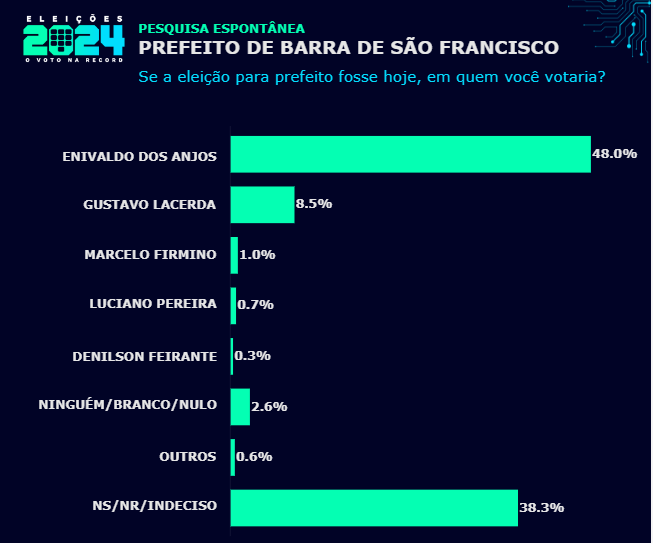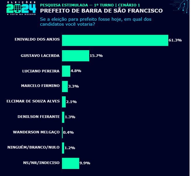 No primeiro cenário, com sete candidatos, Enivaldo dos Anjos aparece com 61,3%. Gustavo Lacerda tem 15,7% e Luciano Pereira surge com 4,8%. Em seguida aparecem Marcelo Firmino, com 3,3%, Elcimar de Souza Alves (PSDB), com 2,1%, Denilson Feirante, com 1,3%, e Wanderson Melgaço (PSB), com 0,4%.