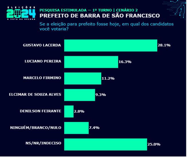No cenário seguinte, sem o atual prefeito e Wanderson Melgaço, Gustavo Lacerda foi escolhido por 28,1% dos eleitores ouvidos. Em seguida aparecem Luciano Pereira, com 16,3%, Marcelo Firmino, com 11,2%, Elcimar de Souza Alves, com 9,3%, e Denilson Feirante, com 2,8%.