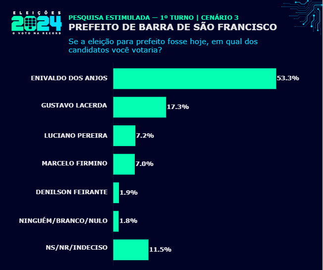 No terceiro cenário estimulado, sem Elcimar de Souza Alves e Wanderson Melgaço, Enivaldo dos Anjos aparece com 53,3% da intenção de voto, seguido por Gustavo Lacerda, com 17,3%, Luciano Pereira, com 7,2%, Marcelo Firmino, com 7,0%, e Denilson Feirante, com 1,9%.