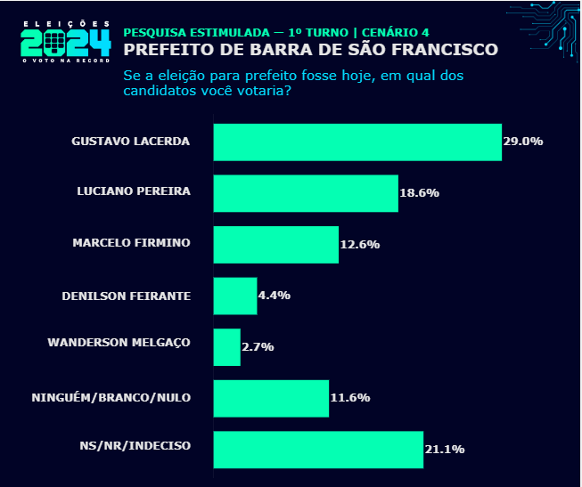 No quarto e último cenário proposto, sem Enivaldo dos Anjos e Elcimar de Souza Alves, Gustavo Lacerda aparece com 29,0%. Luciano Pereira vem em seguida, com 18,6%. Marcelo Firmino, com 12,6%, Denilson Feirante, com 4,4%, e Wanderson Melgaço, com 2,7%, aparecem logo atrás.