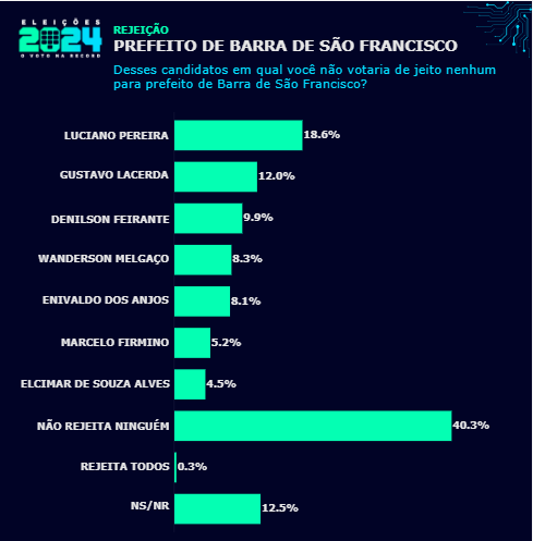 Quando apresentada a lista com os sete candidatos e questionados em quem não votariam, 18,6% dos eleitores entrevistados citou Luciano Pereira, 12,0% apontou Gustavo Lacerda, 9,9% disse Denilson Feirante, 8,3% mencionou Wanderson Melgaço, 8,1% citou Enivaldo dos Anjos, 5,2% apontou Marcelo Firmino e 4,5% Elcimar de Souza Alves.