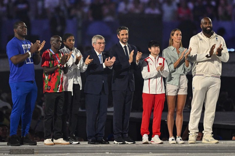 O ator Tom Cruise também fez uma participação na cerimônia ao descer de rapel do alto do Stade de France para receber a bandeira dos Jogos e “levar” aos Estados Unidos.
